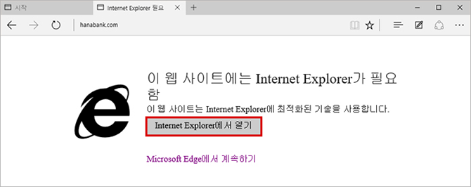 Microsoft(MS) Windows 10의 (2015-07-28 출시) 기본 브라우저인 Edge(엣지) 브라우저 에서는 보안프로그램 설치가 불가능합니다. 아래의 화면이 나오면 ‘Internet Explorer에서 열기’를 선택하시어 사용하시기 바랍니다.