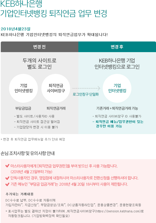 KEB하나은행 기업인터넷뱅킹 퇴직연금 업무 변경