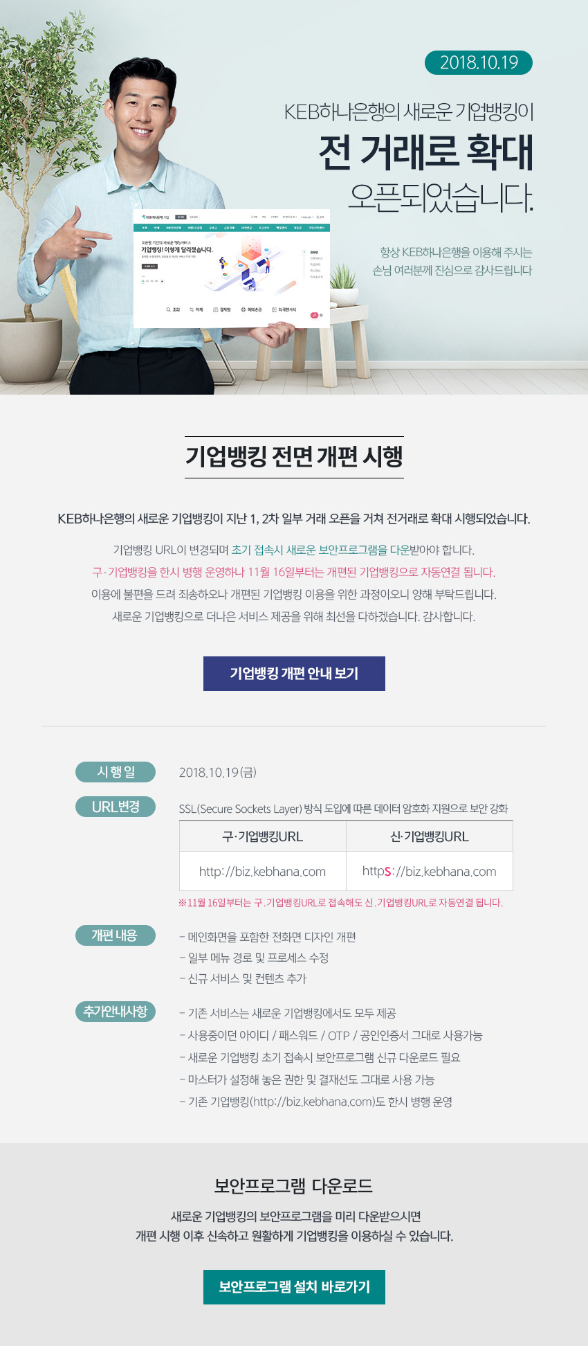 항상 KEB하나은행을 이용해 주시는 손님 여러분께 진심으로 감사드립니다. KEB하나은행의 새로운 기업뱅킹이 지난 1, 2차 일부 거래 오픈을 거쳐 전 거래로 확대 시행됩니다. 새로운 기업뱅킹으로 접속시 접속주소(URL)가 변경되기 때문에 최초 접속시에는 새로운 보안프로그램을 재 설치해야 합니다. 구.기업뱅킹을 한시 병행 운영하나 11월 16일부터는 개편된 기업뱅킹으로 자동연결 됩니다. 이용에 불편을 드려 죄송하오나 개편된 기업뱅킹 이용을 위한 과정이오니 양해 부탁드리며, 새로운 기업뱅킹으로 더 나은 서비스 제공을 위해 최선을 다하겠습니다. 감사합니다. 시행일 : 2018년 10월 19일(금) 변경주소(URL) : https://biz.kebhana.com추가안내사항 - 기존 서비스는 새로운 기업뱅킹에서도 모두 제공 - 사용중이던 아이디/패스워드/공인인증서 그대로 사용가능 - 새로운 기업뱅킹 초기 접속시 보안프로그램 신규 다운로드 필요 - 마스터가 설정해 놓은 권한 및 결재선도 그대로 사용 가능 - 기존 기업뱅킹(http://biz.kebhana.com)도 한시 병행 운영